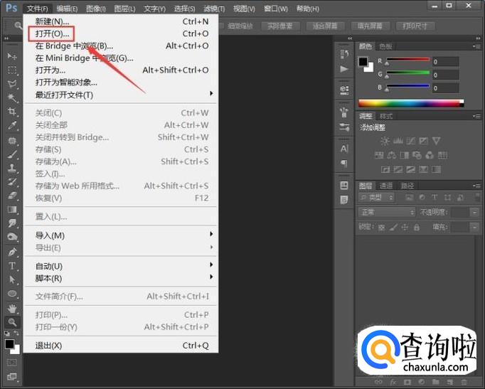 打开ps之后我们在文件菜单那里找到打开选项,如图所示: