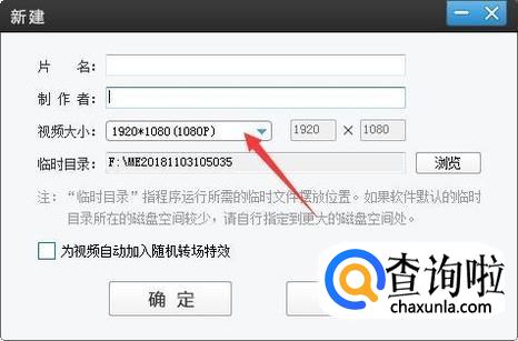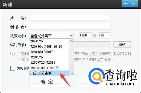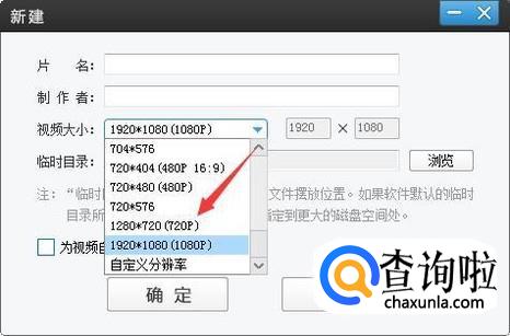 出现新建对话框,在视频大小处点击,在弹出的大小尺寸中就可以选择需要的大小。