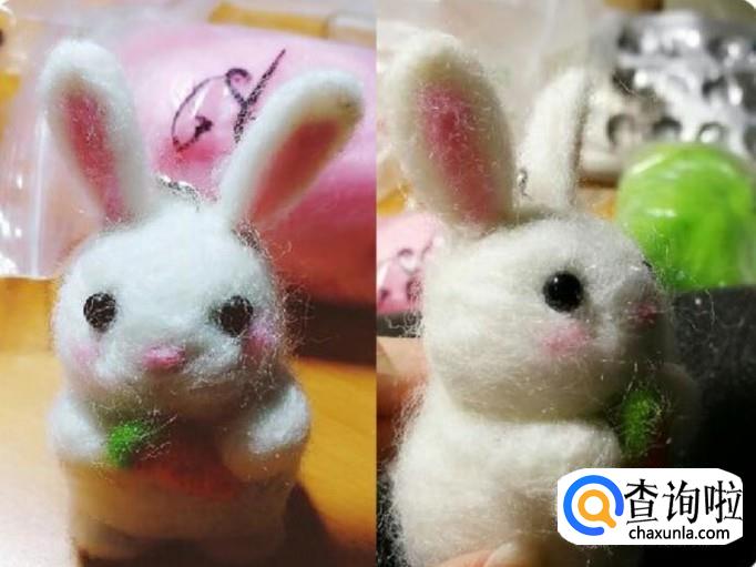 最后一般是加些少量的毛,戳一下,感觉比较毛茸茸的可以了。还有胡萝卜是可加可不加的,橙色部分是个厚的椭圆,然后加一撮少量的绿,我做的还是有点仓促的,你们可以不着急。要慢慢戳的均匀哦。最后成品就是这个样子了。
