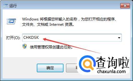 在弹出的运行框里输入“CHKDSK”,然后点击下面的“确定”,如下图所示。