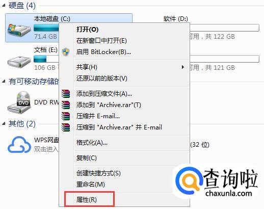 鼠标右键c盘,在弹出的选项框里选择“属性”,如下图所示。