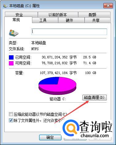 在新弹出的c盘属性界面点击下面的“磁盘清理”就可以了,如下图所示。
