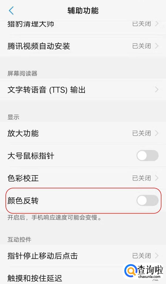 进入辅助功能后,我们可以看到一个“颜色反转”,如果手机颜色此时还是底片色的话,这时颜色反转的开关是开启的;我们要做的就是点击后面的按钮,把它关闭即可。