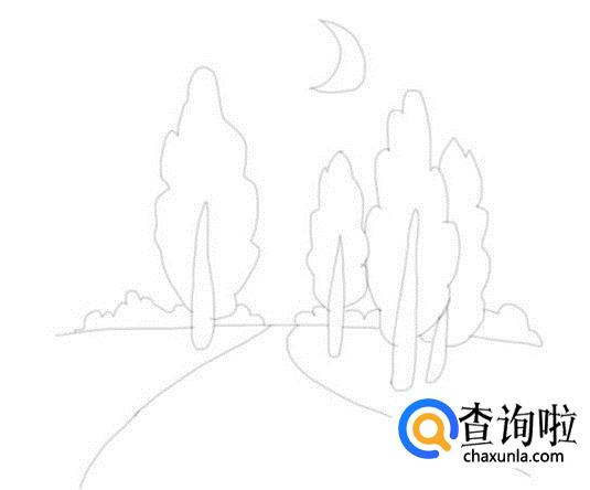 最后再在树林的上面我们再画出月亮,这样我们的树林就画好了,如图所示: