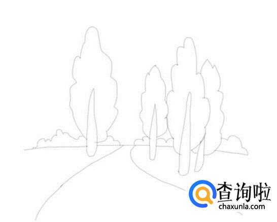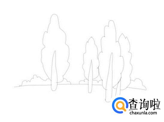 再在树木的基础上再画出远处的地平线,然后再在地平线上画出树木,如图所示: