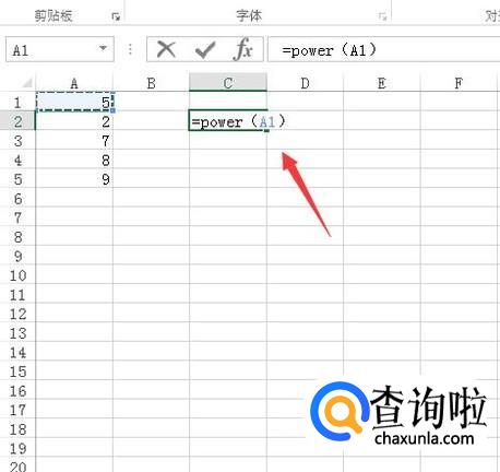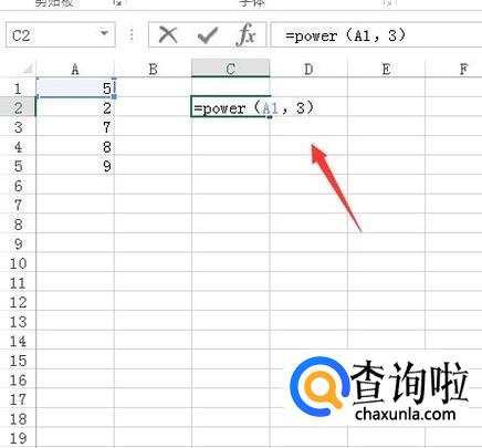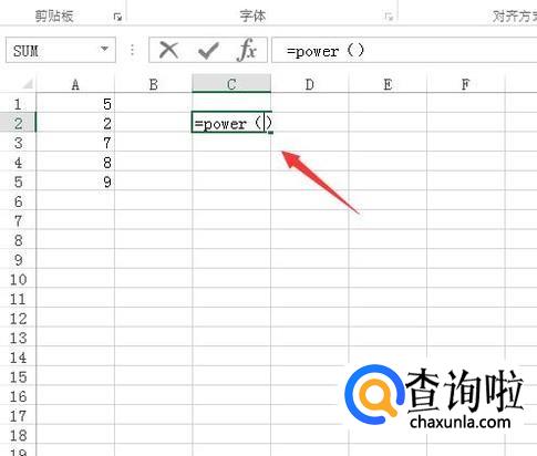使用excel将我们的文件打开,然后选择单元格并在选择的单元格内输入“=power()”函数,如图所示: