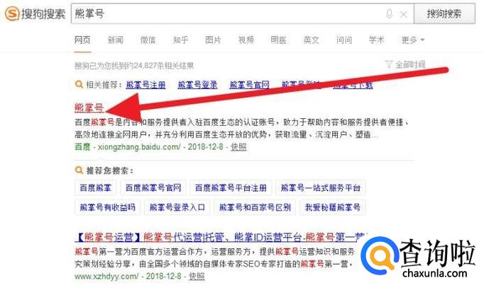 首先打开搜狗浏览器。输入熊掌号,点击搜索,打开第一个链接,如图。