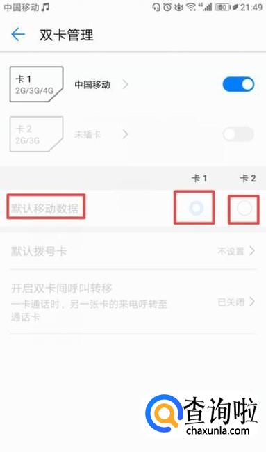 弹出的界面,我们就可以看到默认移动数据的设置了,我们根据我们的需求进行选择卡1或者卡2就设置好了。