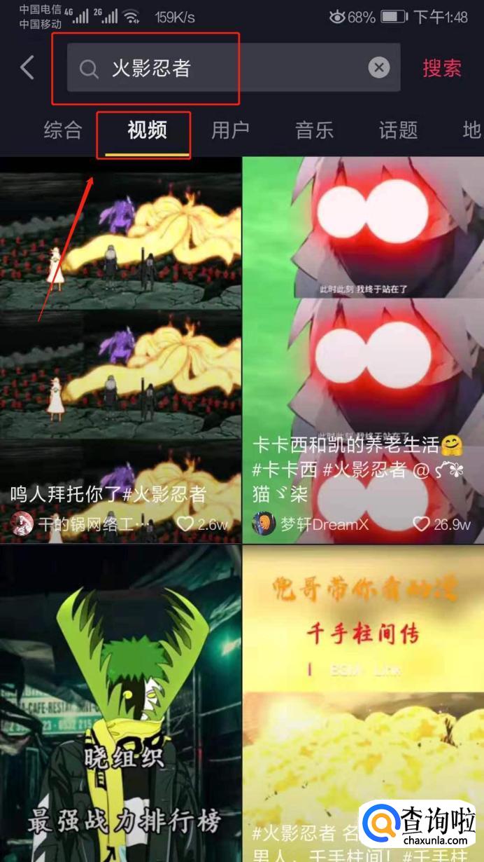 搜索火影忍者,点击视频,在里面找到喜欢的短视频。