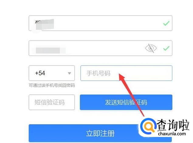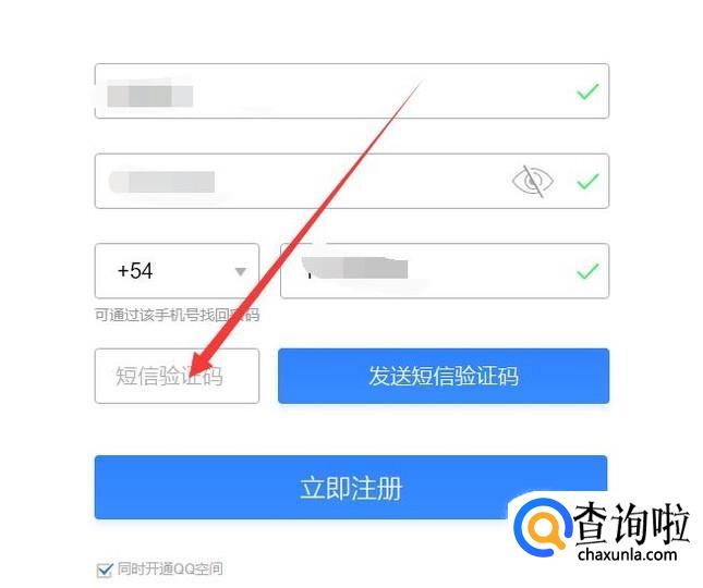 手机收到验证码之后,填写在图示位置,点击“立即注册”即可完成在国外申请QQ,如图所示。