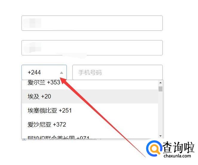 填写完这两项之后,点击图示位置选择所在国家的区号,如图所示。