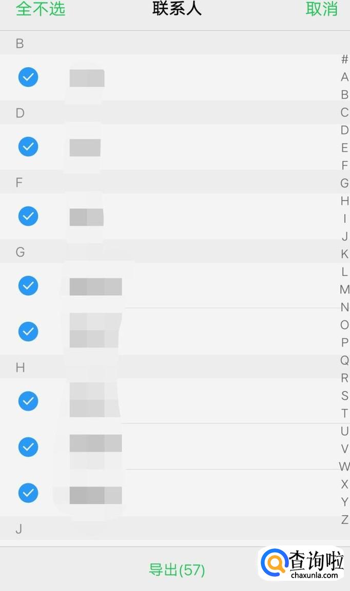 点击以后,会出现手机联系人,点击左上角的“全选”,接着点击下方的“导出”。