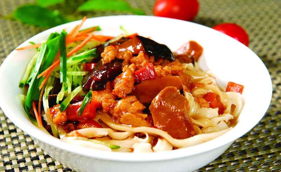 北京炸酱面流行于北京等地,由菜码、炸酱拌面条而成。将黄瓜、香椿、豆芽、青豆、黄豆切好或煮好,做成菜码备用。然后做炸酱,将肉丁及葱姜等放在油里炒,再加入黄豆制作的黄酱或甜面酱炸炒,即成炸酱。面条煮熟后,捞出,将水沥干,浇上炸酱,拌以菜码,即成炸酱面(锅挑)。也有面条捞出后用凉水浸洗,沥干,再加炸酱、菜码的,称“过凉面”。