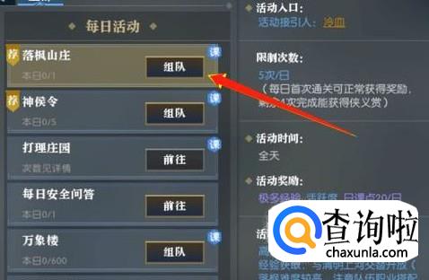 还有一种方法是点击游戏上方的“活动”键,进入“每日任务”界面,组队做落枫山庄、清明上河、神州奇侠和试剑天下任务,都可以获得活跃度。
