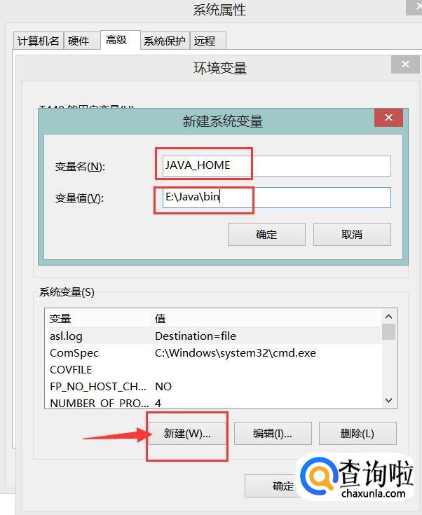 在上面第18个步骤的时候点击下面的“新建”,然后在新弹出的对话框里把变量名文本框输入:“JAVA_HOME”,变量值文本框输入JDK的安装路径,然后点击确定,如下图所示。