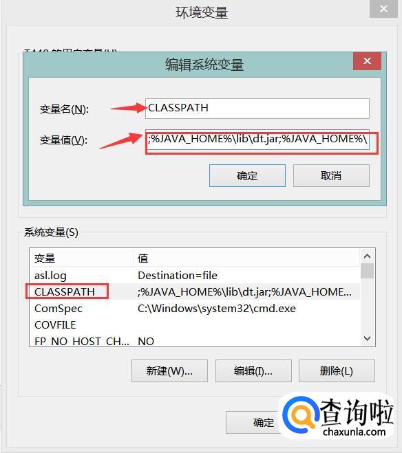 然后选择“CLASSPATH”变量,点击“编辑”,接下来在变量值文本框的最前面添加“.;%JAVA_HOME%libdt.jar;%JAVA_HOME%libtools.jar;”,添加好后点击确定,如下图所示。