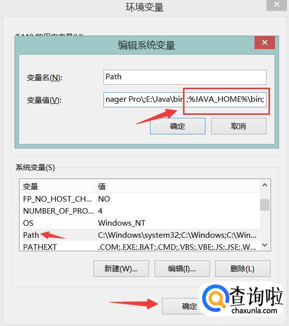 在新界面里面选择“PATH”变量,然后点击“编辑”,接下来在变量值文本框的最后面添加“ ;%JAVA_HOME%bin;”或者是““%JAVA_HOME%bin;%JAVA_HOME%jrebin;””,添加好后点击确定,如下图所示。
