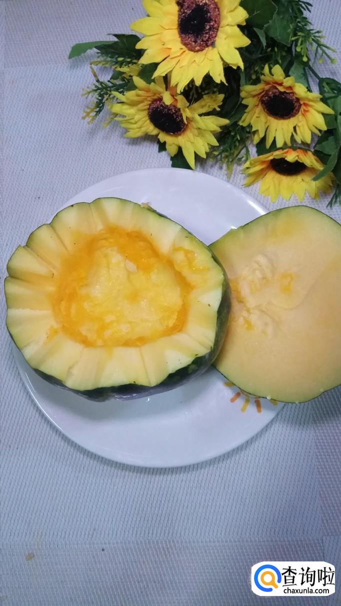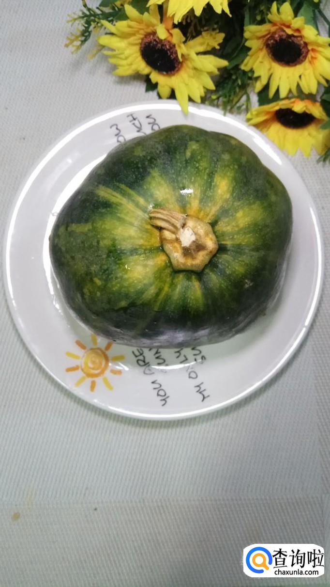 准备一个圆南瓜,洗净后,在1/3处切开,去除内瓤,用刀在边缘处刻出花形,然后将南瓜放在盘中备用。