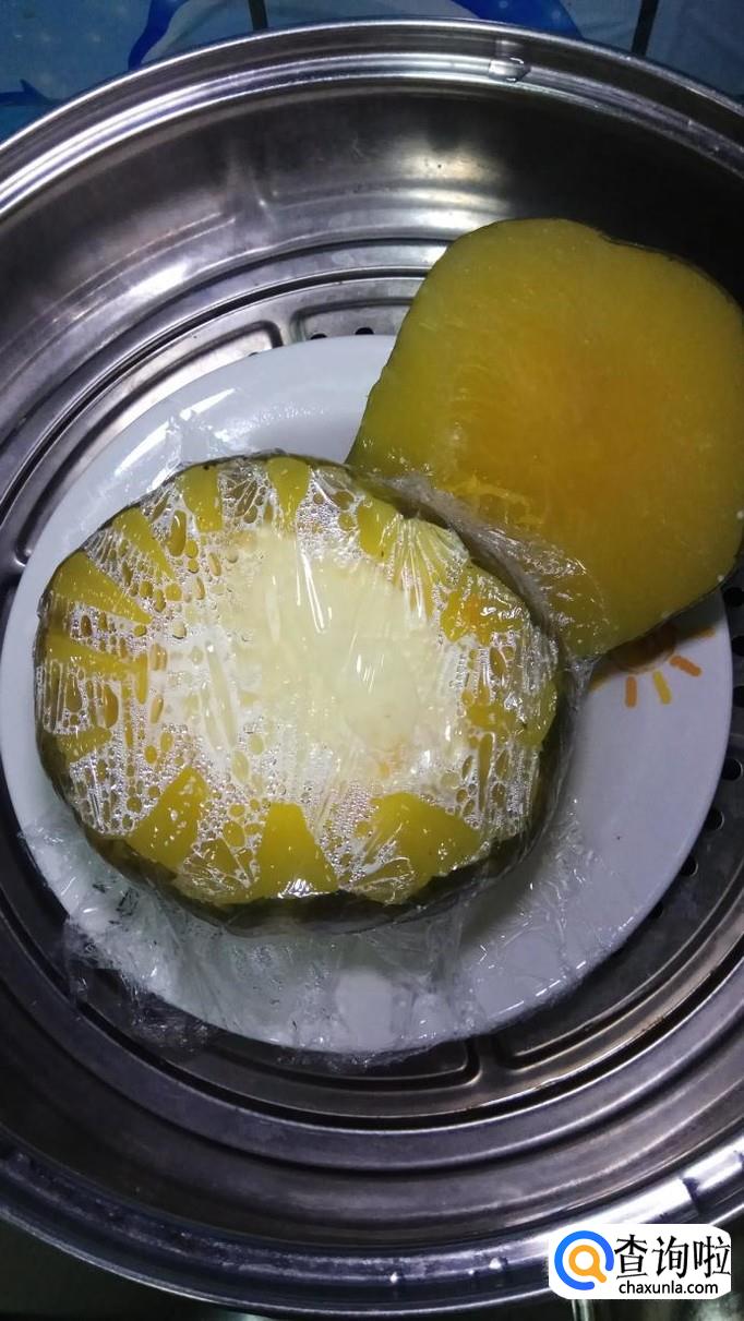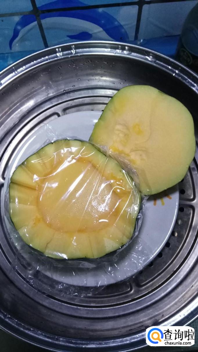 用牙签在保鲜膜上扎几个小洞,然后将保鲜膜盖在南瓜上面,这样可以防止水蒸气滴到鸡蛋羹里,影响美观。