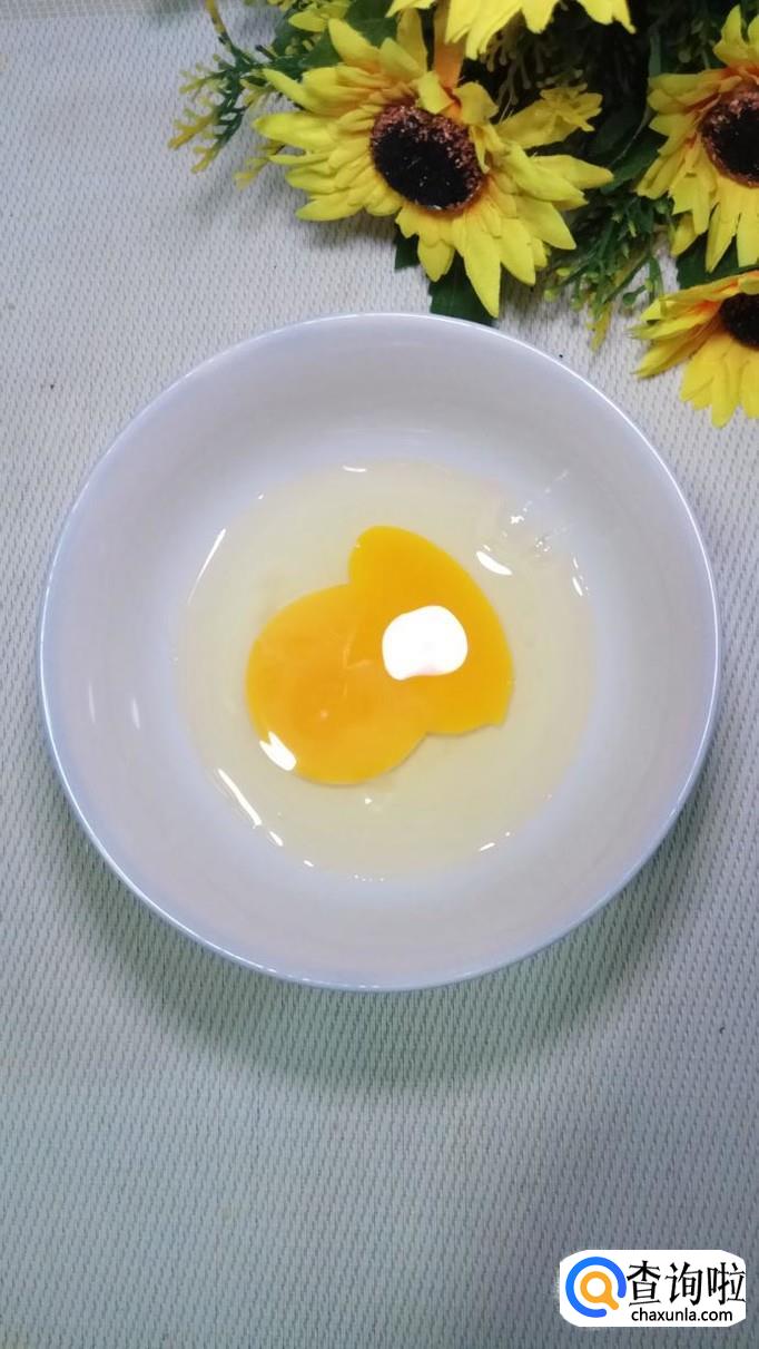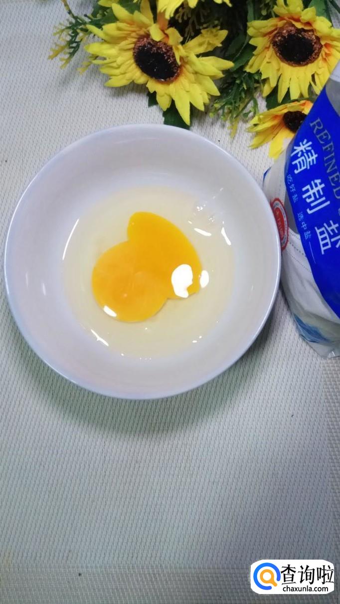碗中打入一个鸡蛋,加少许食盐,用打蛋器打散,打散后,撇去浮沫,这样做出来的鸡蛋羹更加润滑。