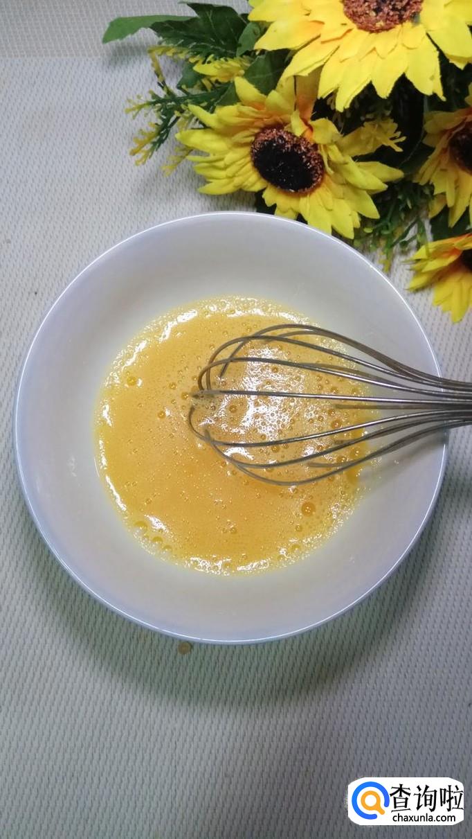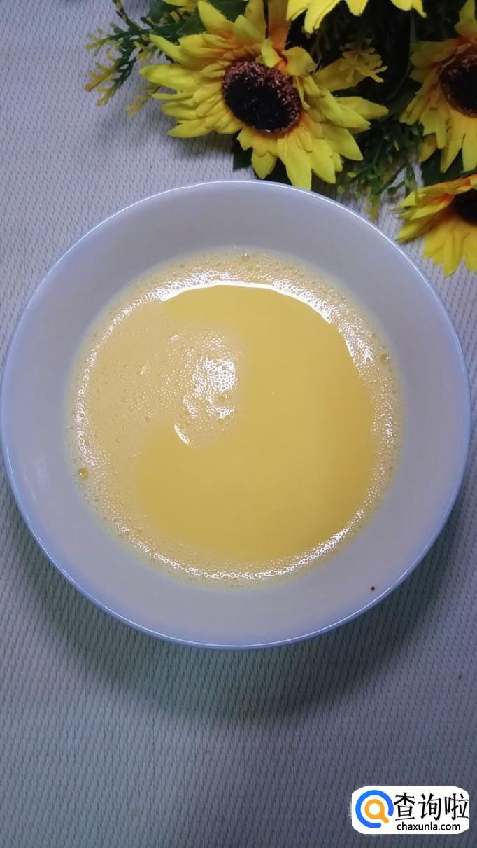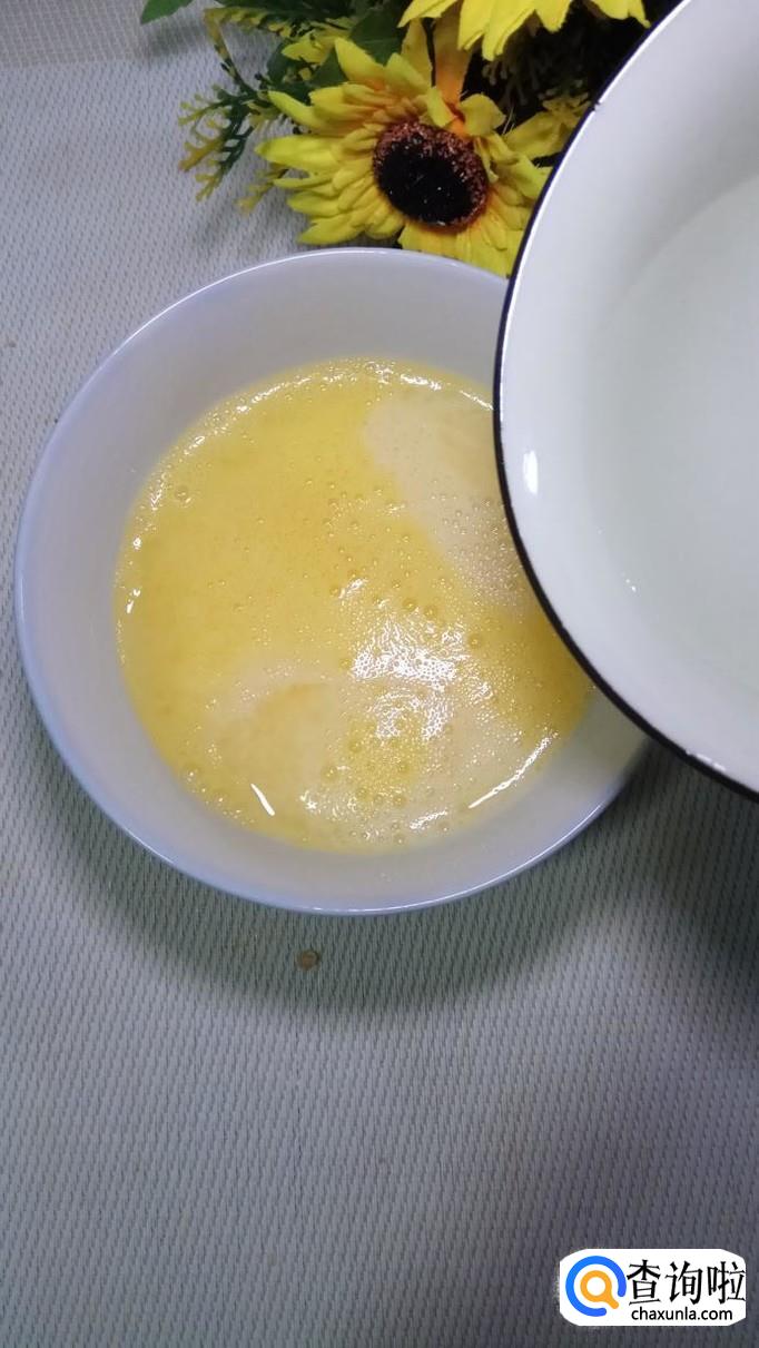 然后再加入比鸡蛋的量稍微多一点的清水,用打蛋器打一会儿,将浮沫再一次撇去。