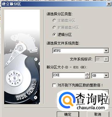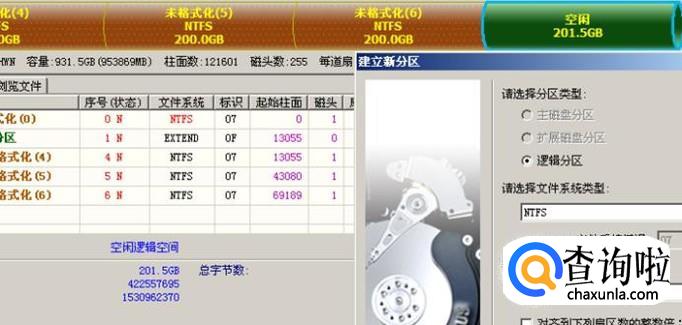 这是分区类型就是“逻辑分区了”,我打算把剩下的空间分为4个分区,就在“新分区大小”里填上合适的数字。同样的操作划分完剩下的分区。