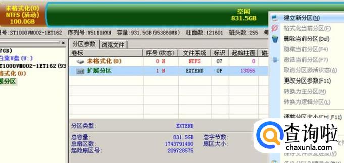 这时会看到整个扩展分区变为了绿色,我们在上面右键单击,再点“建立新分区”。