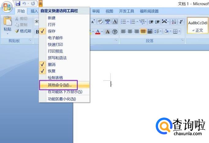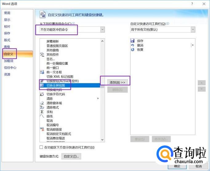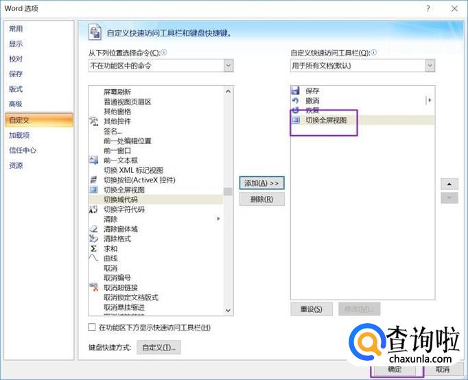 弹出的界面,我们点击自定义,然后选择不在功能区的命令,之后点击切换全屏视图,之后点击添加;