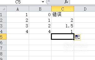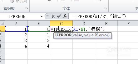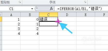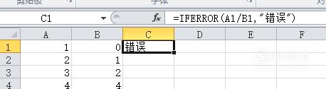 在C1单元格输入公式=IFERROR(A1/B1,"错误")公式意思是判断A2/B2的值是否正确,如果正确则返回A1/B1的结果,否则返回“错误”字符。如下图: