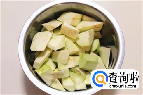 茄子刨去皮,用刀切成滚到状,大小自己掌握,不要太小也别过分大就行了,然后放进盐水里浸泡十分钟,捞出来控干水分,一定要控干水分哦同志们。
