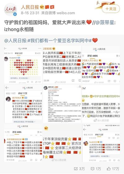 直到人民日报发起一个话题名为“我们都有一个爱豆名字叫阿中”,中是指中国。这时有人用饭圈格式称呼自己为izhong,更推动了这一格式的传播。