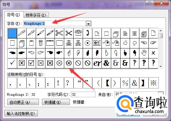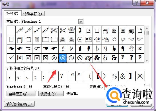 然后我们在字体选择那里下拉选择“wingdings 2”这个选项,之后就会出现圆圈里面带叉的这个符号,我们选择这个符号,然后点击”插入“。