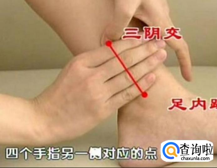 三阴交的位置在小腿内侧,足内踝尖上三寸处。取正坐曲膝位,足内踝尖是脚内侧踝骨最高的地方,除大拇指外,其余四指并拢,刚好三寸,横放于内踝尖上方,小腿中线和手指的交叉点就是三阴交穴所在。