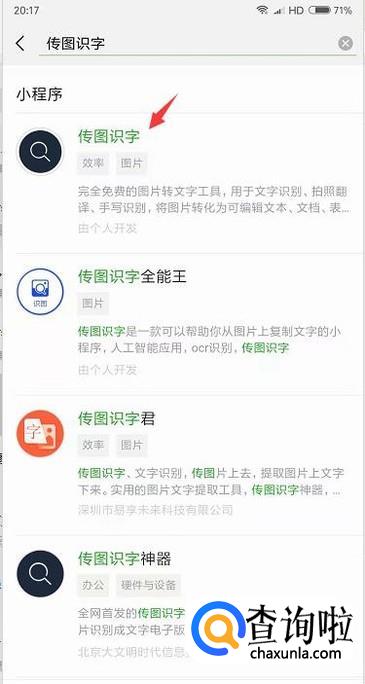 输入传图识字四个字来进行搜索,第一个小程序就是了,点击打开。