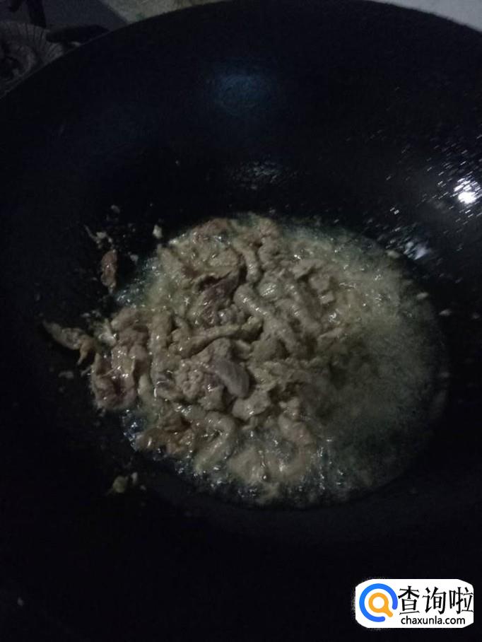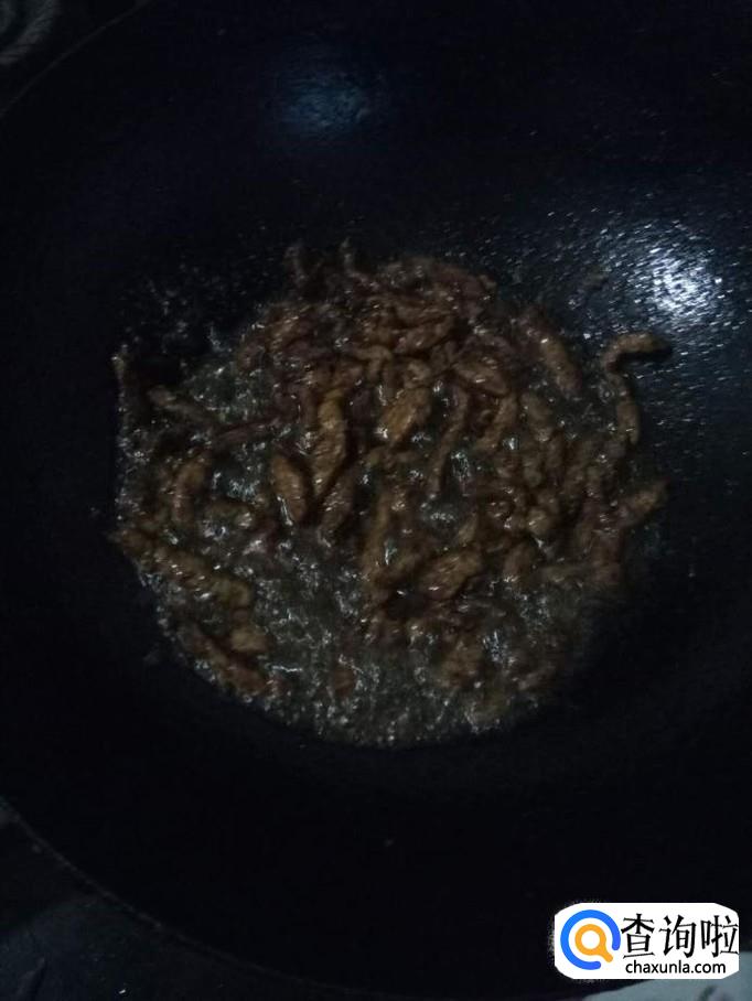 起锅热油,油热以后放入腌好的肉丝,划开煸炒几下。