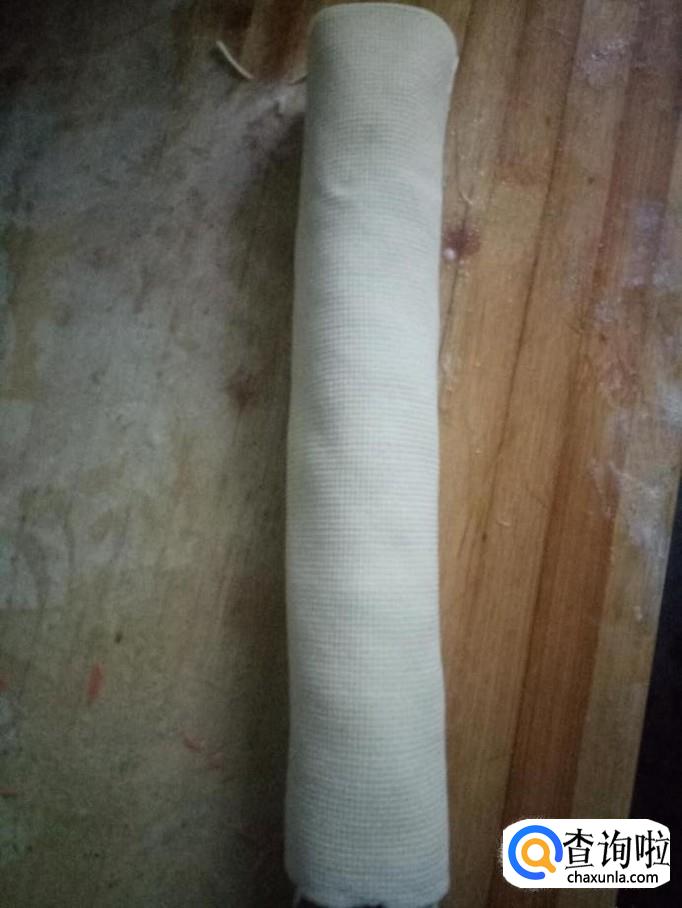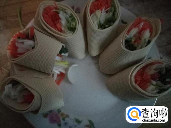 把菜依次放好后,从豆腐皮的一头向另一头卷起。