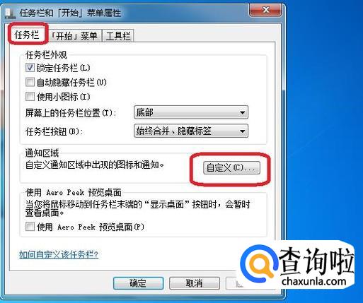 出现任务栏属性面板,我们点击“任务栏”标签内的“自定义”按钮。