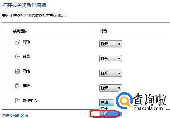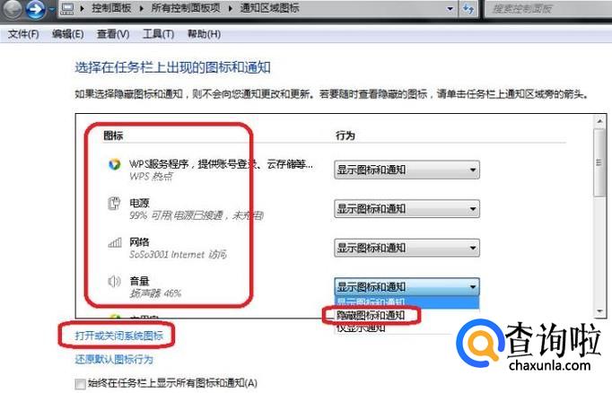 如图所示,对于一些程序和通知图标,我们都可以在“行为”中,通过选择,把图标或者通知隐藏起来。