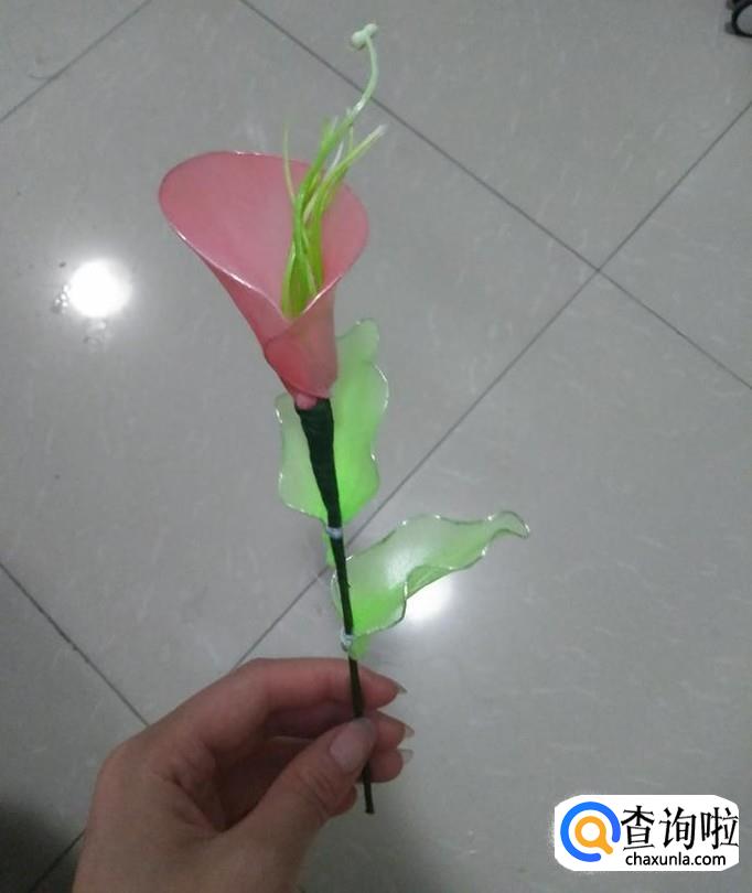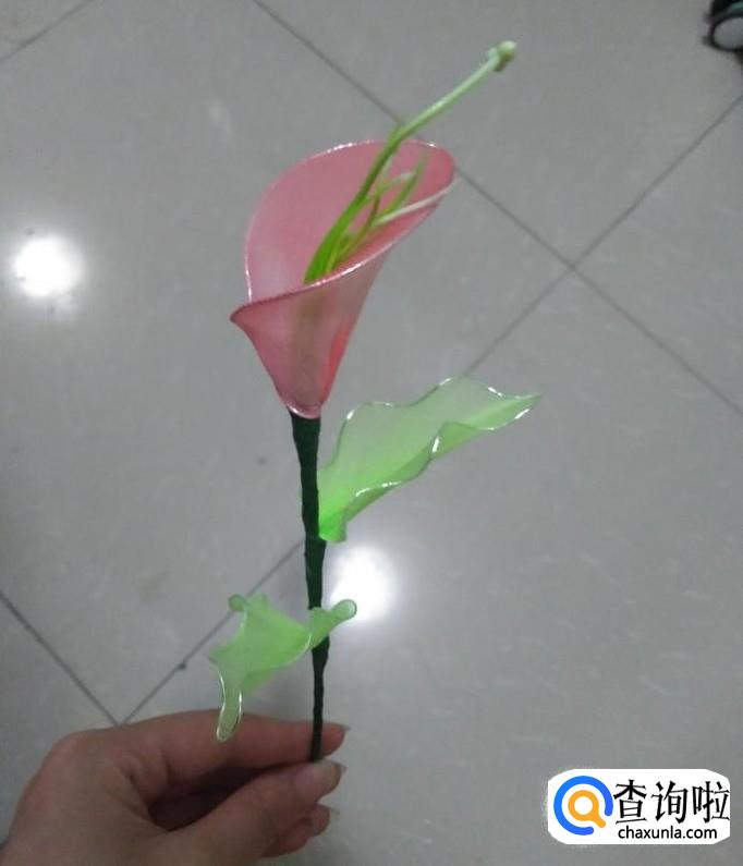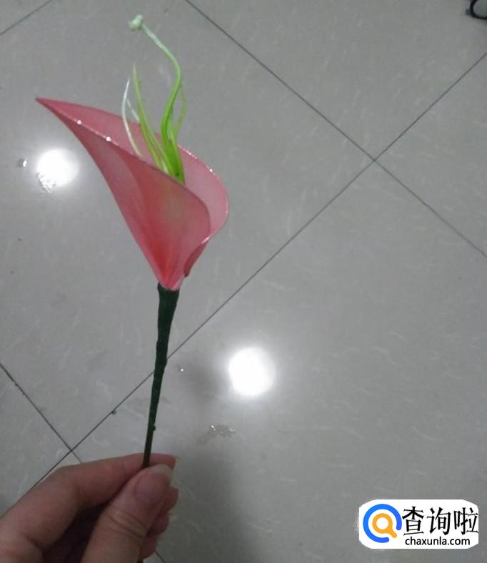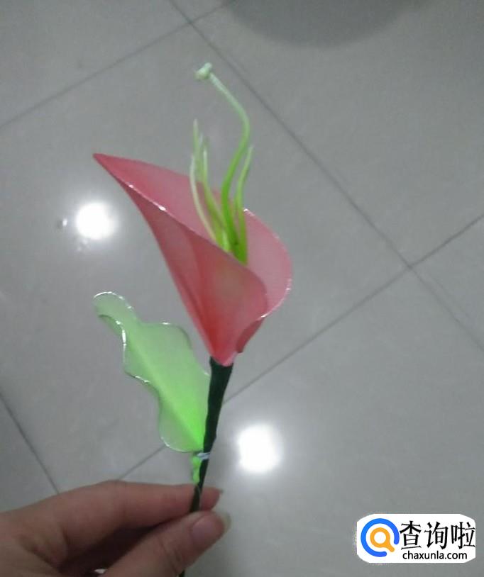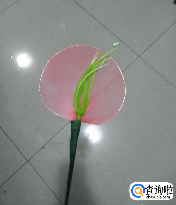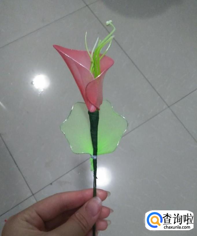 我们将做好的银色铁圈固定在花朵下,如下图一所示,然后用手拉其尖端,将其做成叶子状,如下图2所示,再将另一片叶子固定在其下端部位,在重复刚刚的操作,到此,美丽的马蹄莲就做好了。