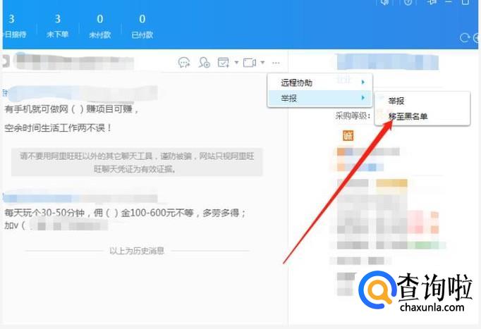 还有一种就是打开你们旺旺上的聊天对话框,点击右方的三个点点这里,举报-移至黑名单,这样买家在你店铺就购买不了东西。这是方法二。