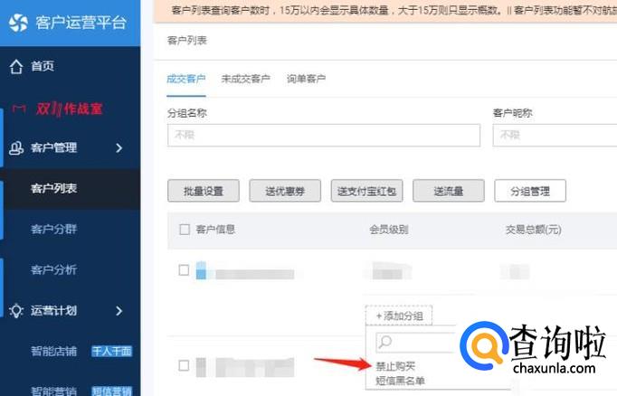 找到不想卖给某个客户的“旺旺号”,找到之后,点击添加分组这里,选择“禁止购买”即可。这是方法一。