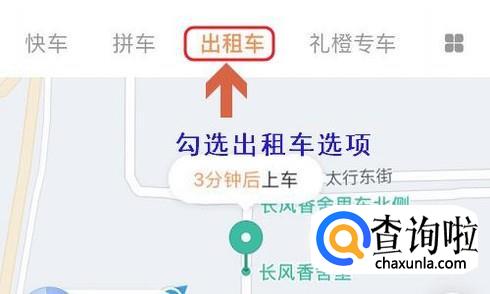 注册或者登录以后,依旧返回到滴滴首页,我们在最上方找到并点击“出租车”这一项,如下图;