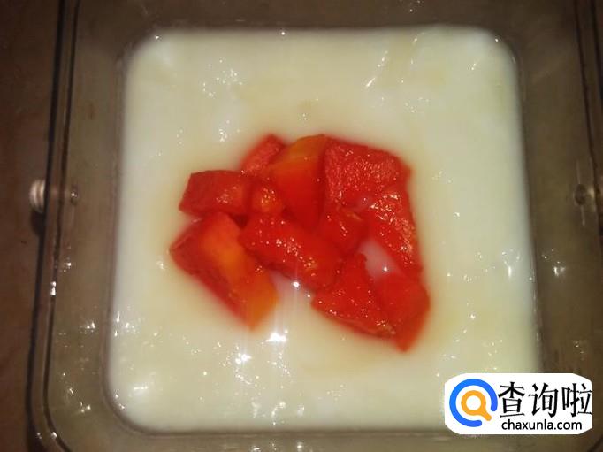鸡蛋清2个,鲜奶1杯,白糖适量,木瓜丁适量。