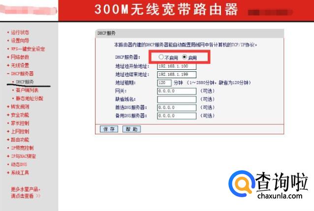 点击DHCP服务器,要开启DHCP功能,这样才能保证设备接入LAN口或连接wifi的时候路由器能为其分配IP地址。