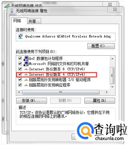 先打开控制面板,找到网络和共享中心。找到连接的无线网卡,并右键无线网卡属性,找到IPv4协议,点击确定。