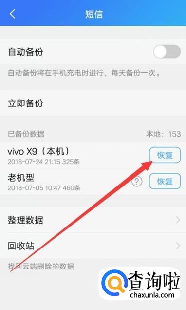 恢复出厂设置之后,再次进入云服务,找到短信,进入之后,选择“恢复”即可。