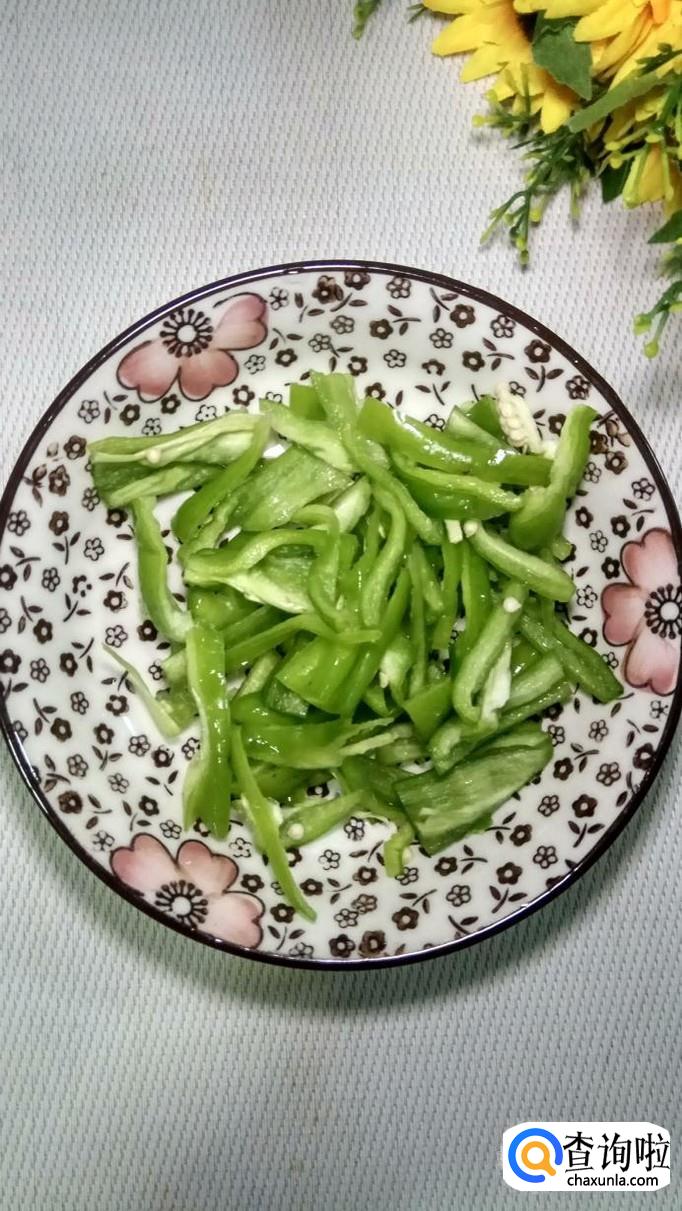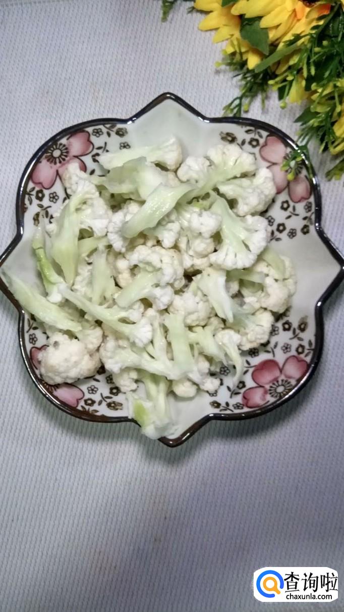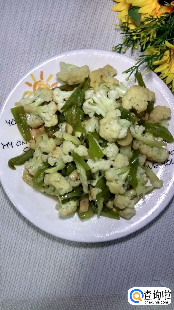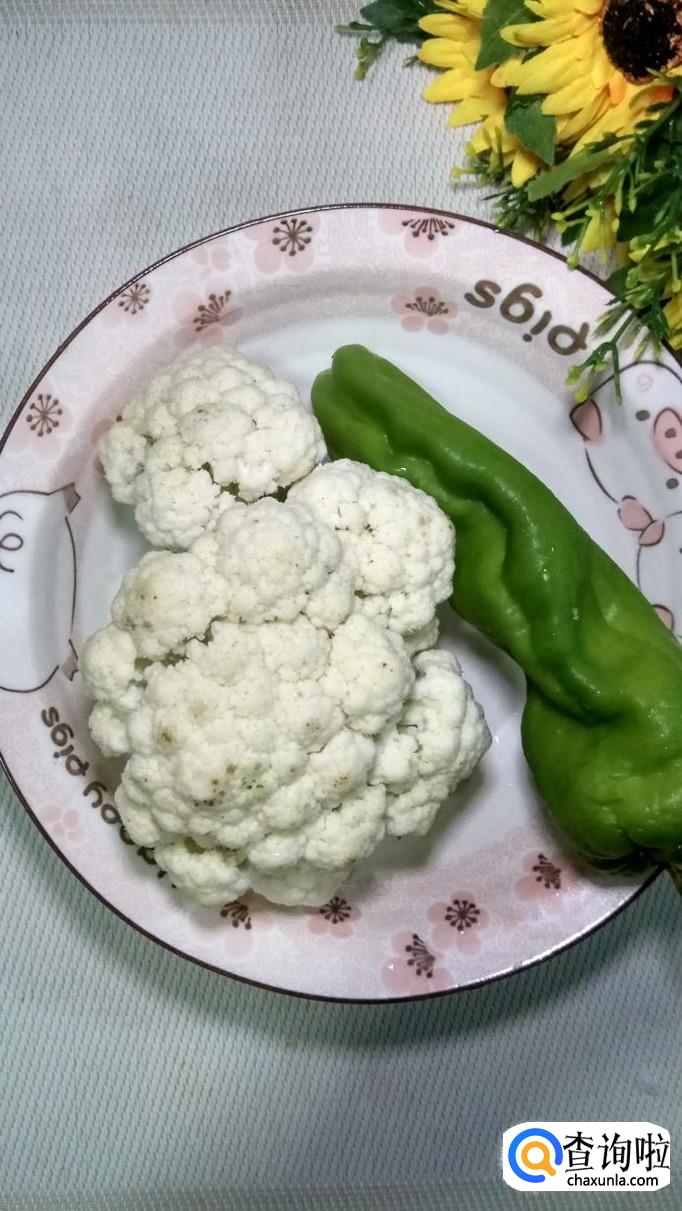 准备适量花菜和青椒,将花菜洗净后撕成小朵,将青椒洗净后切成条,放入盘中备用。注意,花菜千万不要用刀,否则容易碎。