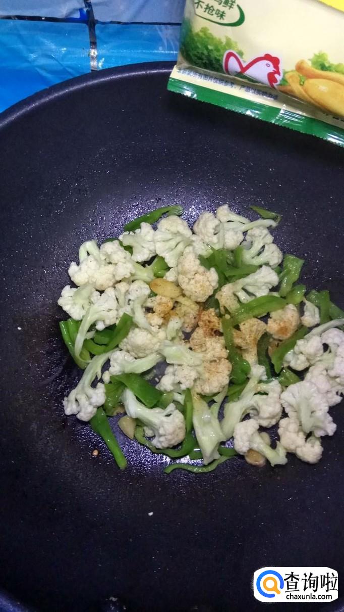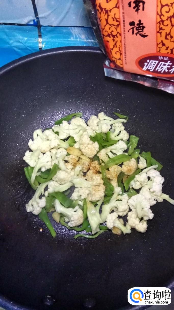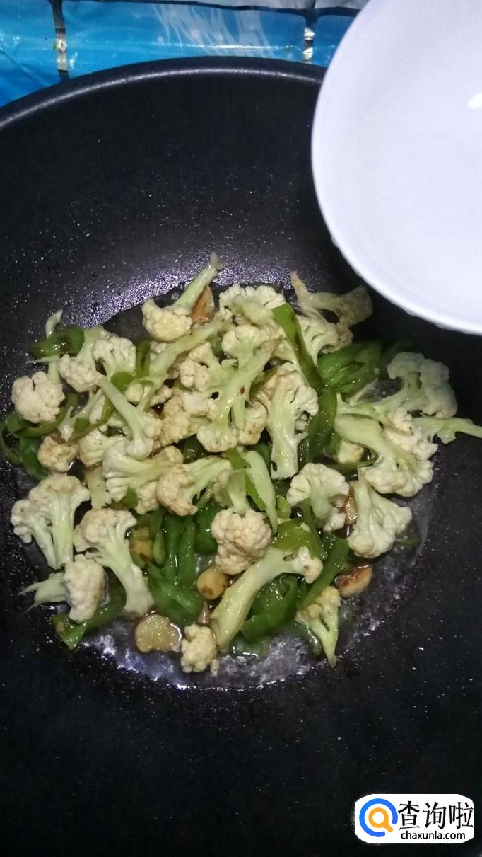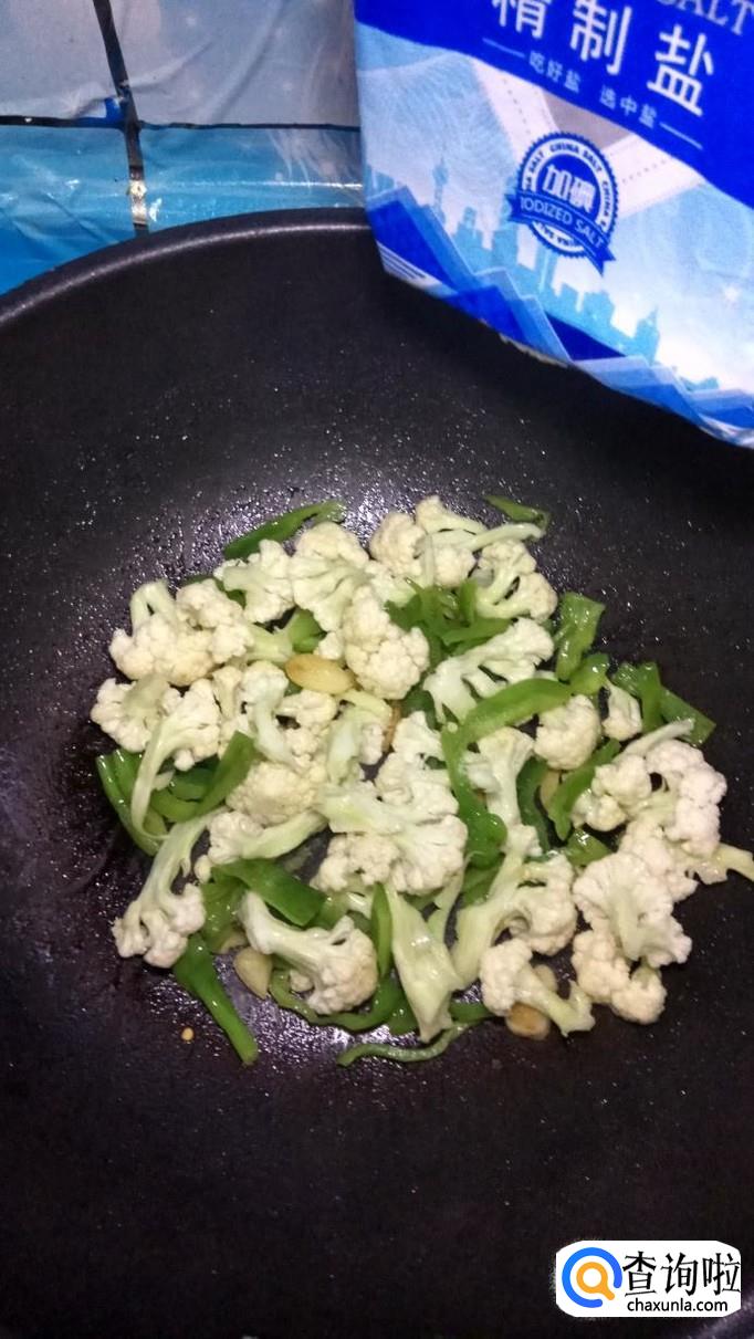 将准备好的花菜,倒入锅中,和青椒一起翻炒。