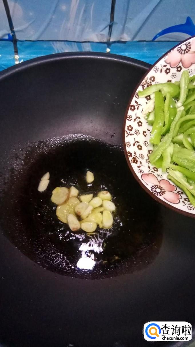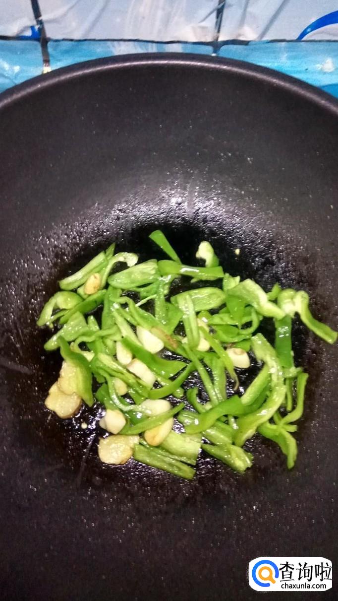 然后将青椒丝倒入锅中,和蒜片,姜片一起翻炒。