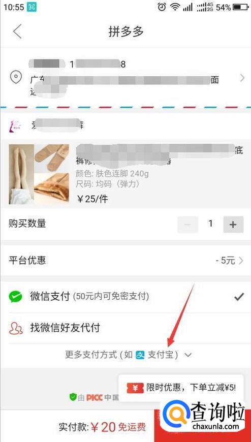 选择好要购买的商品的各项参数,点击确定,进入支付界面,点击更多支付方式(如支付宝)